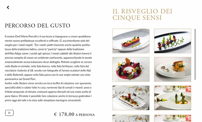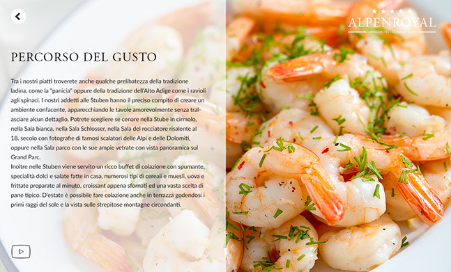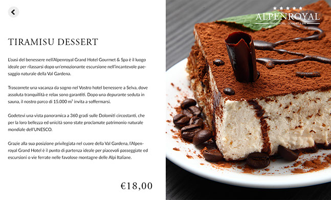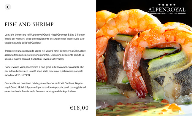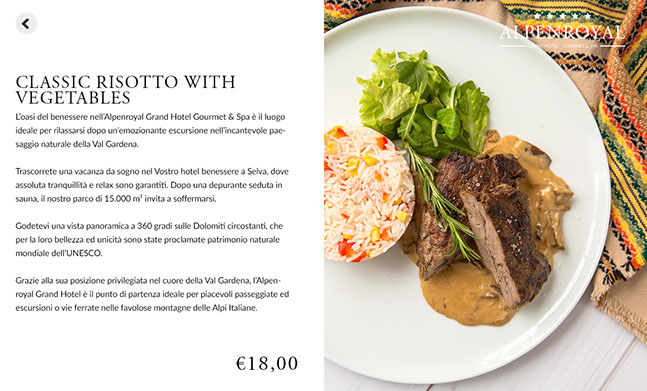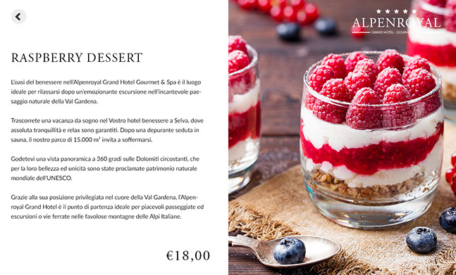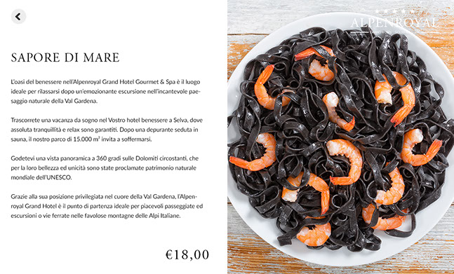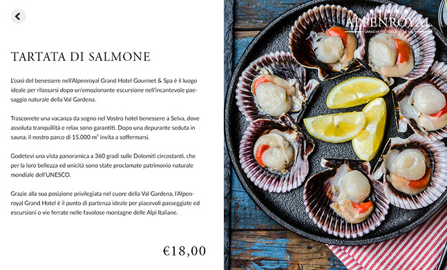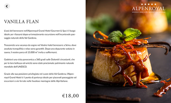 Menù digitale elegante, smart, dinamico e multilingua, facilmente consultabile dagli utenti del web o dai tuoi clienti. Il servizio rapido e sempre aggiornato, offre la possibilità ai tuoi acquirenti di vivere un’esperienza unica e sempre diversa rendendo immersivo l'ecosistema informativo del brand.